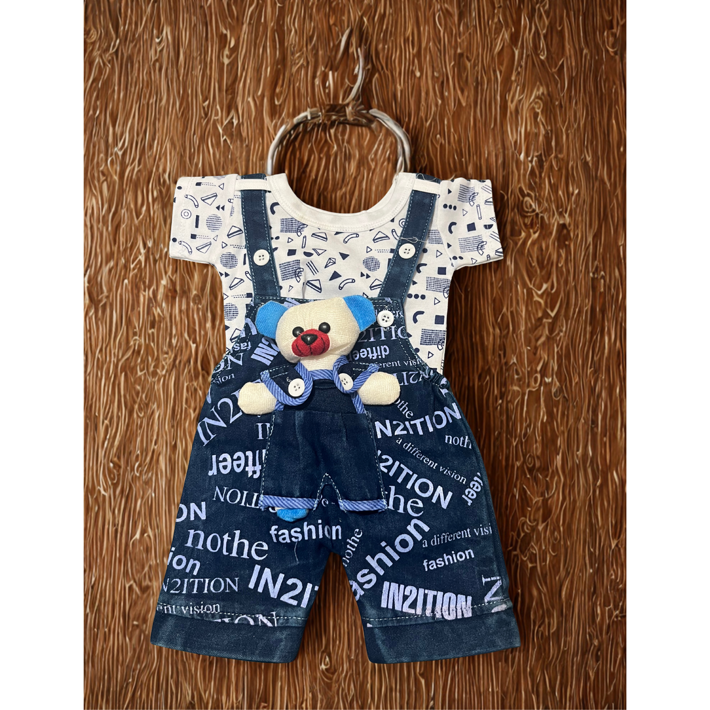π Dungaree: Lightweight denim-style fabric with printed text and stitched toy