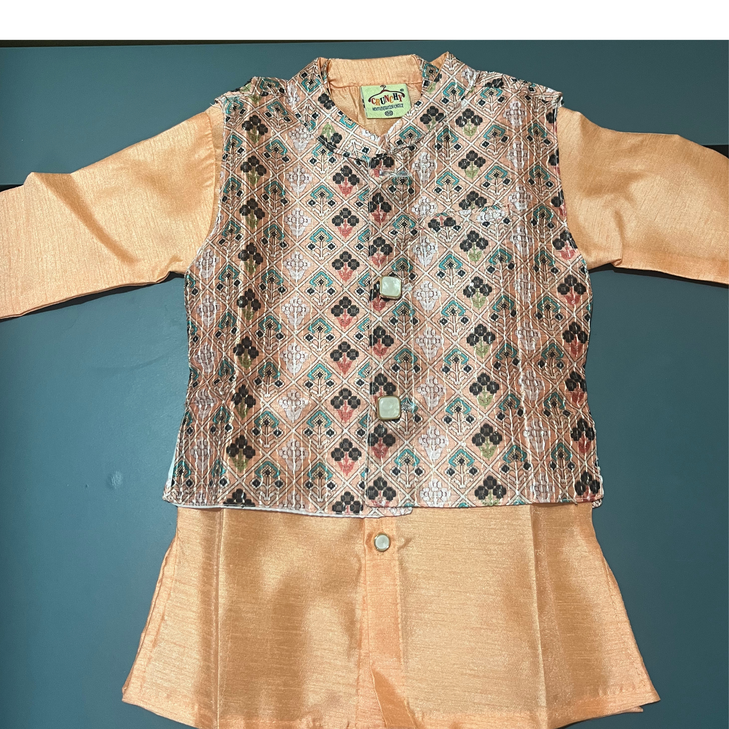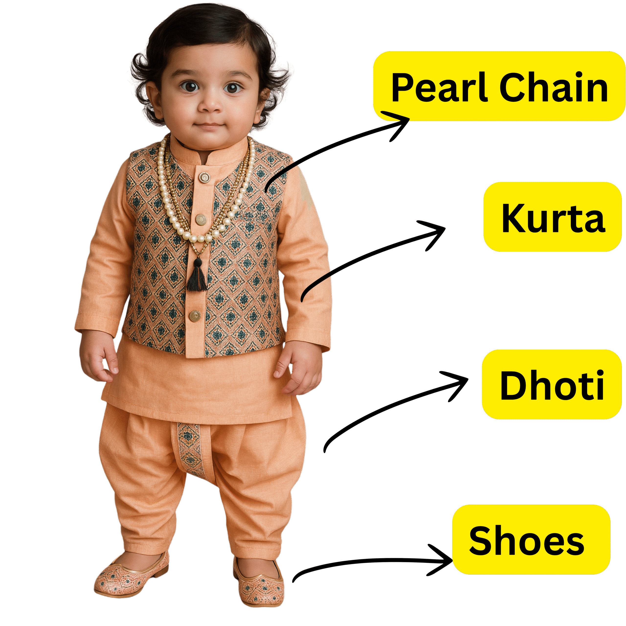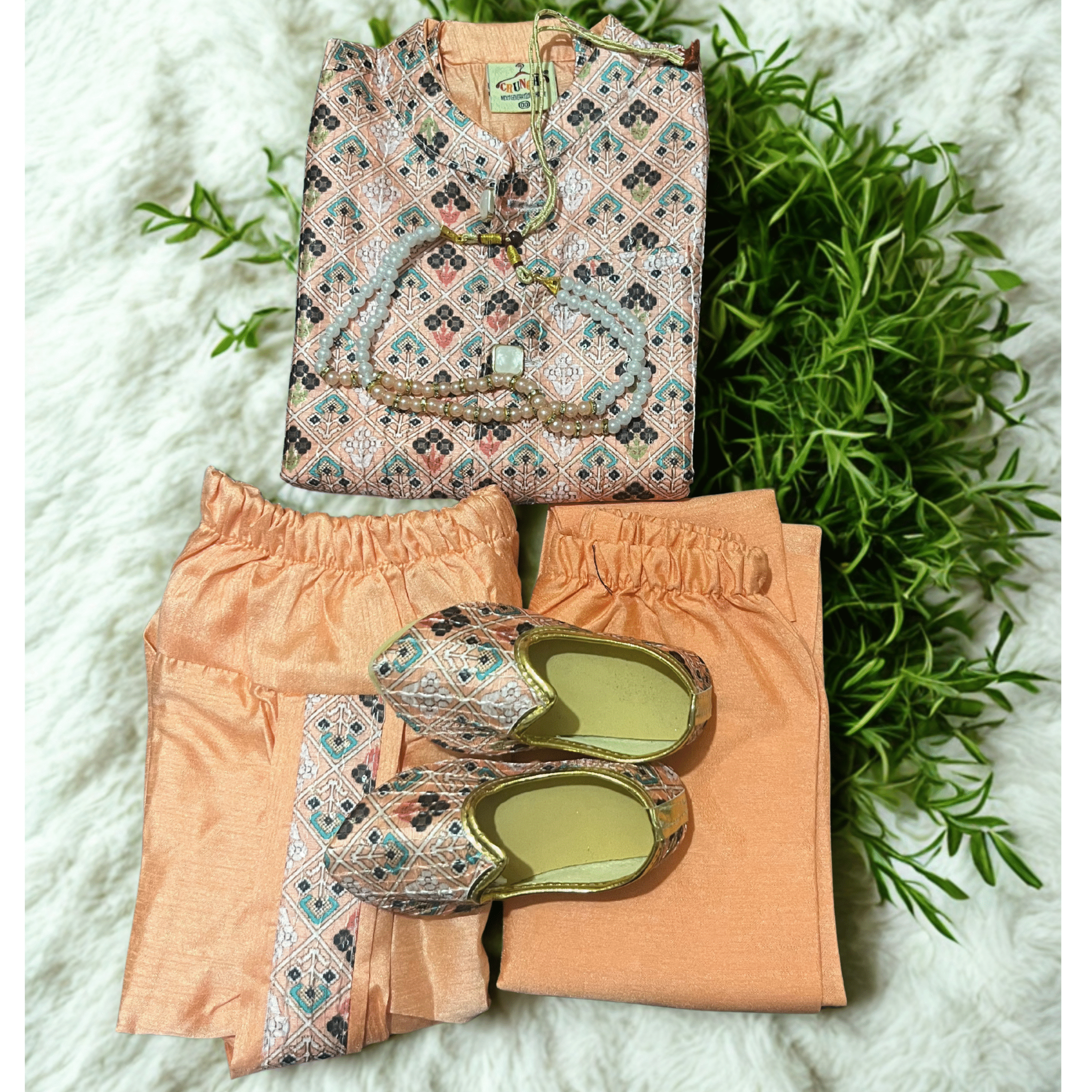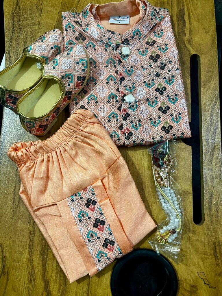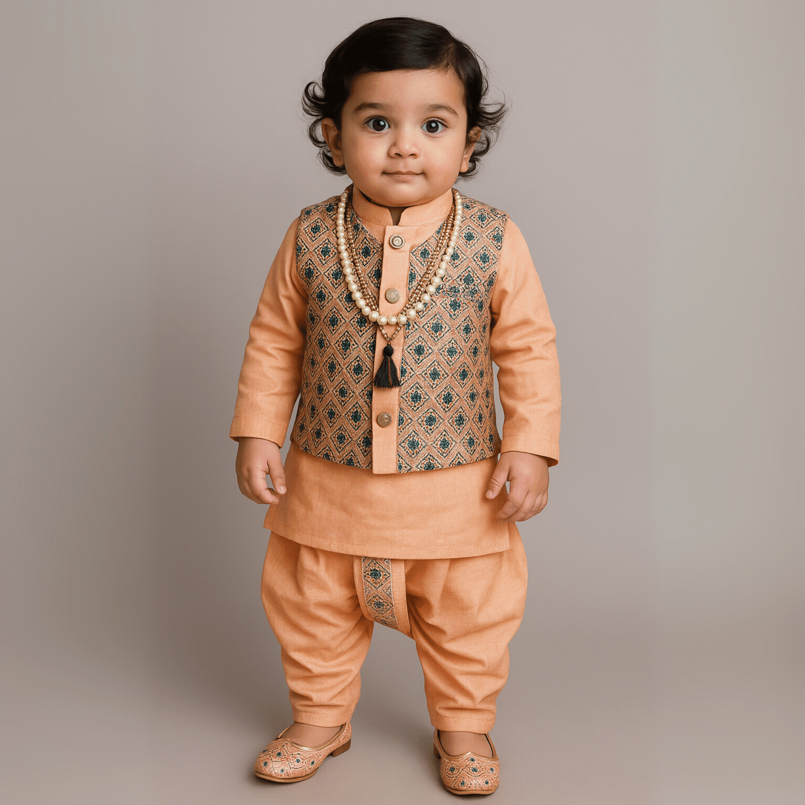Peach - Baby Kurta Dhoti Set (0–9M) – With Shoes & Pearl ChainPeach – Baby Kurta Dhoti Set (0–9M) – With Shoes & Pearl Chain