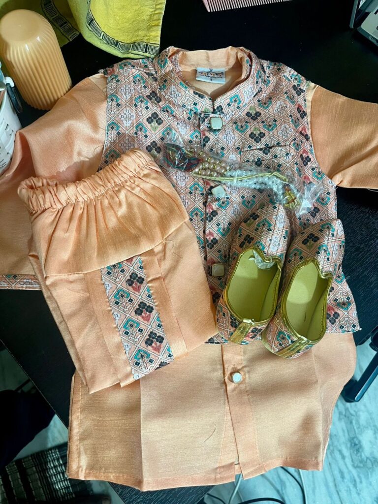 3 reviews for Peach – Baby Kurta Dhoti Set (0–9M) – With Shoes & Pearl Chain