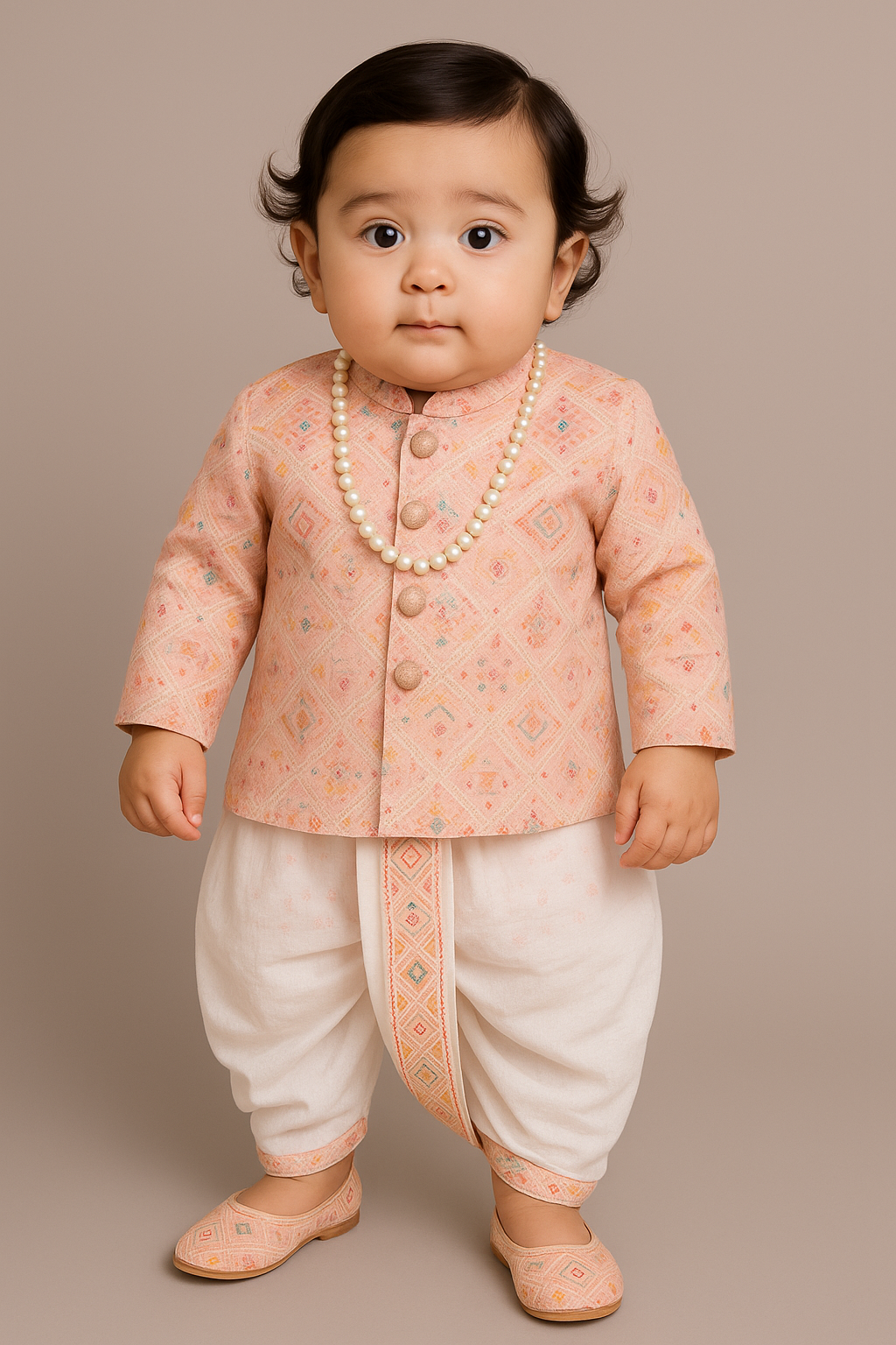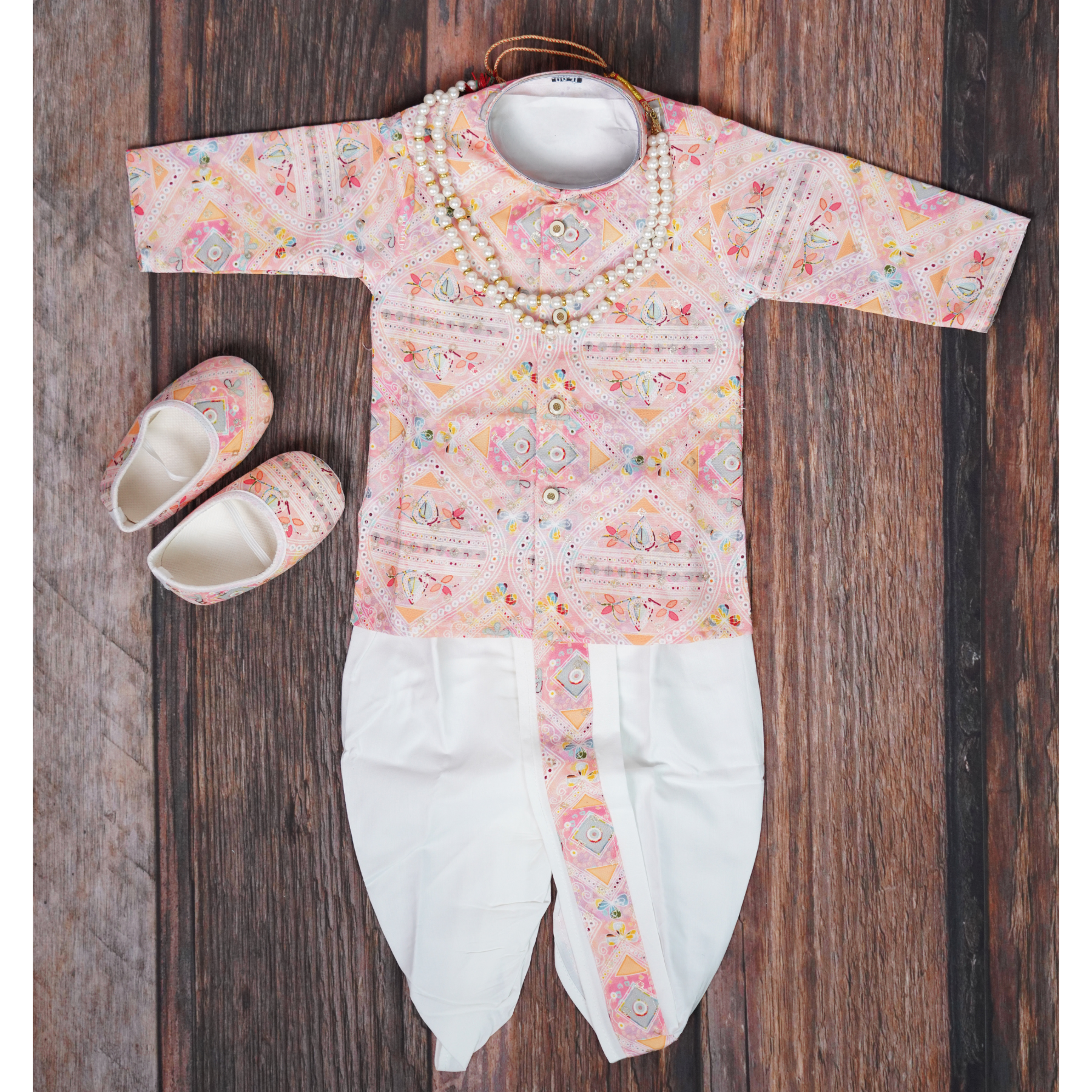 Light Pink- Baby Kurta Dhoti Set (0–12M) – With Shoes & Pearl ChainLight Pink- Baby Kurta Dhoti Set (0–12M) – With Shoes & Pearl Chain