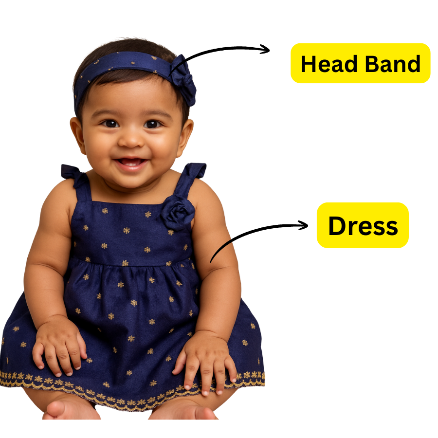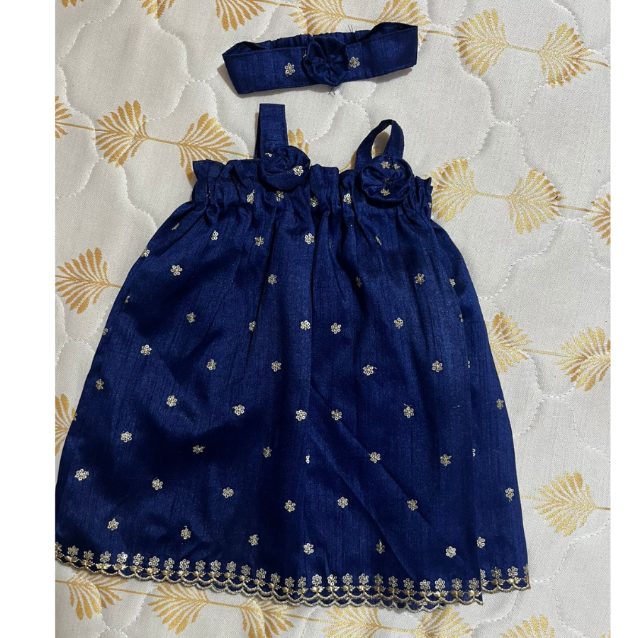 Charvi- Blue Baby half Frock with border design and HeadbandCharvi- Blue Baby half Frock with border design and Headband